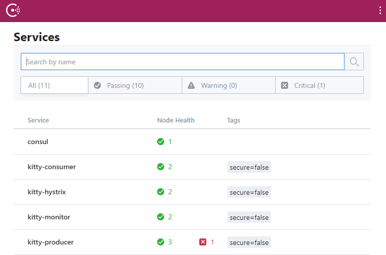 依次启动 monitor、producer、consumer,hystrix 服务,访问 http://localhost:8500 查看注册中心管理界面。