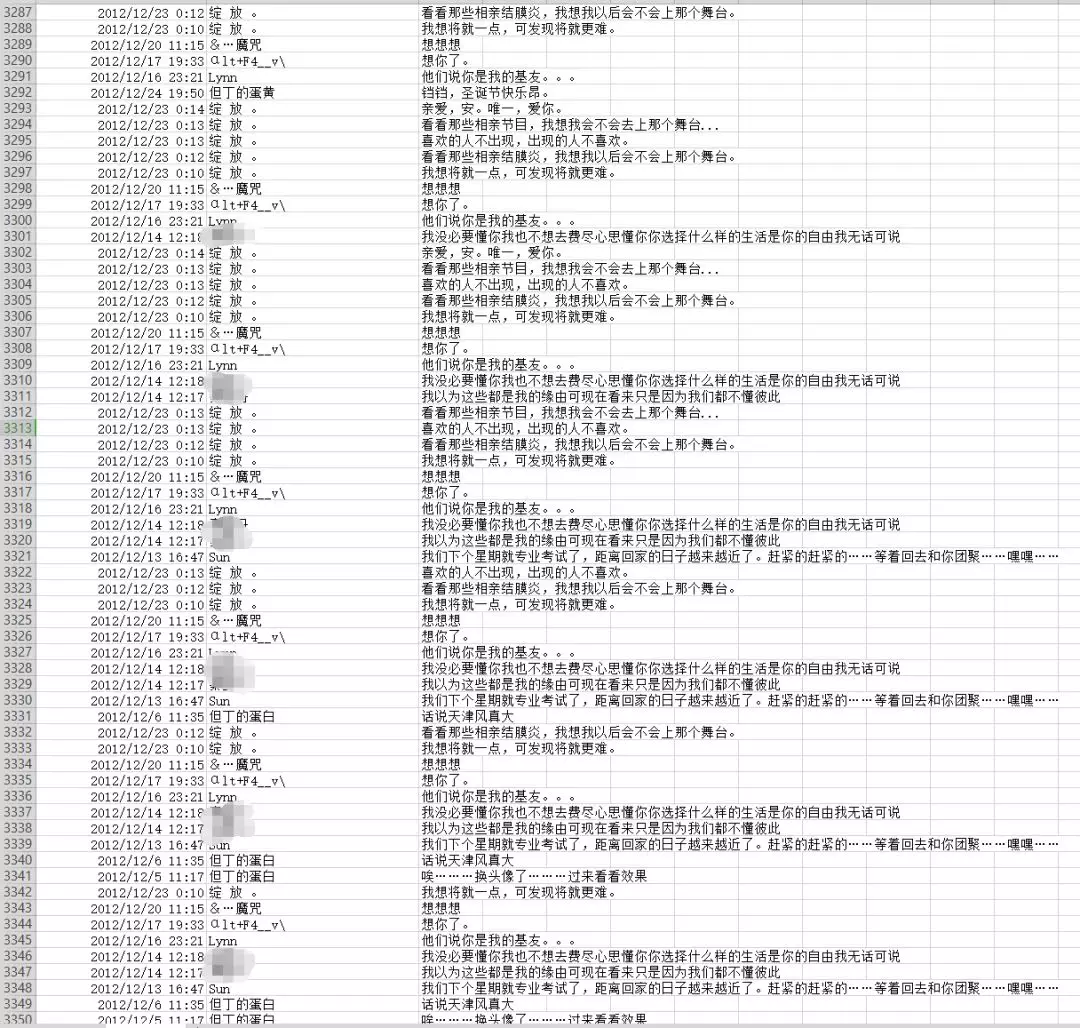 # 将总数据转化为data frame再输出df = pd.DataFrame(data=content_arr, columns=['留言日期', '昵称', '留言内容'])df.to_csv('QQ_ZONE.csv', index=False, encoding='utf-8_sig')print('已保存为csv文件.') |