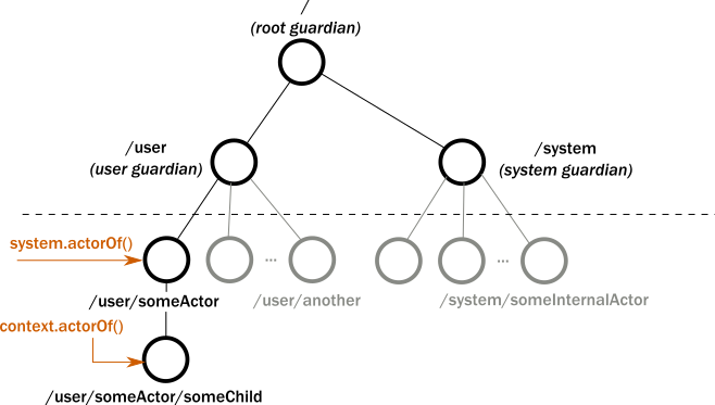 如图所示,一个 akka 系统有一个跟节点 root,然后 root 有2个子节点,user 和 system ,你定义的 actor 都在 user 下,system 下都是系统定义的