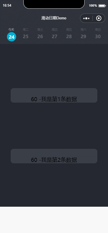 实现要求:顶部固定悬浮的是获取未来一周的日期,分为上下两部分,上面部分显示星期,下面则显示具体日期。今天则显示今天,可点击头部具体日期,可向左向右滑动。