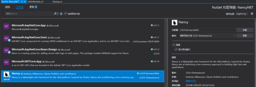创建一个.Net Core App,我们需要在项目中安装NancyFx,通过nuget安装,也可以通过命令行,NancyFx的依赖项可能有OAuth的邀请,大部分OAuth2.11就ok了。