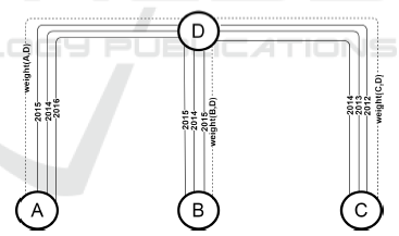 虽然,三对节点呈现相同的交互频率(每个三个连接),但与FTi相比,最近交互的节点获得了更高的权重。相互作用的频率随着每对节点之间最近相互作用的年龄而衰减。 (A,D)对的权重最高。事实上,由于节点在当前时间内互动(2016年),A和D之间的交互频率没有受到衰减。另一方面,对(B,D)和(C,D)的节点之间的相互作用的频率确实遭受了一些衰减。节点C和节点D之间的最后一次互动发生在2014年(年份差= 2岁)。 B和D最后在2015年互动(年份差= 1年)。因此,(C,D)的权重高于(B,D)的权重。