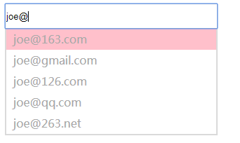 28 overflow: hidden; 29 padding-left: 10px; 30 box-sizing: border-box; 31 } 32 .email-sug li:hover{ 33 background-color:skyblue; 34 } 35 .email-sug li.active{ 36 background-color:pink; 37 } 38 </style> 39 </head> 40 41 <body> 42 <div class="wrapper"> 43 <input type="text" id="input-email" autofocus="autofocus"> 44 <ul class="email-sug" id="email-sug-wrapper"> 45 46 </ul> 47 </div> 48 <script> 49 var postfixList = ["163.com", "gmail.com", "126.com", "qq.com", "263.net"]; 50 var txt = document.getElementById("input-email"); 51 var sug = document.getElementById("email-sug-wrapper"); 52 var nowSelectTipIndex = 0; 53 54 //获取输入文本 55 txt.oninput = function (e) { 56 console.log("event handle4"); 57 //按下的是内容,则重置选中状态,坐标清零,避免光标位置已经计算存入。 58 if (!(e.keyCode == 40 || e.keyCode == 38 || e.keyCode == 13)) { 59 nowSelectTipIndex = 0; 60 } 61 judge(); 62 add(); 63 } 64 //点击事件响应 65 sug.addEventListener("click", function (ev) { 66 //采用事件代理,监听父级点击事件,通过target获取当前li 67 var ev = ev || window.event; 68 var target = ev.target || ev.srcElement; 69 if (target.nodeName.toLowerCase() == "li") { 70 hide(); 71 txt.focus(); //写在return之前,不然无效 72 return txt.value = htmlDecode(target.innerHTML); //解码 73 //return txt.value= target.innerHTML; 74 } 75 }) 76 //键盘事件响应 77 document.addEventListener("keydown", function (e) { 78 var e = e || window.event; 79 var key = e.which || e.keyCode; 80 var list = document.getElementsByTagName("li"); 81 //向下键 82 if (key == 40) { 83 for (i = 0; i < list.length; i++) { 84 list[i].setAttribute("class", ""); 85 } 86 nowSelectTipIndex++; 87 if (nowSelectTipIndex + 1 > list.length) { 88 nowSelectTipIndex = 0; 89 } 90 list[nowSelectTipIndex].setAttribute("class", "active"); 91 } 92 //向上键 93 if (key == 38) { 94 for (i = 0; i < list.length; i++) { 95 list[i].setAttribute("class", ""); 96 } 97 nowSelectTipIndex--; 98 if (nowSelectTipIndex < 0) { 99 nowSelectTipIndex = list.length - 1;100 }101 list[nowSelectTipIndex].setAttribute("class", "active");102 }103 //回车键104 if (key == 13) {105 var x = document.getElementsByClassName("active");106 txt.value = htmlDecode(x[0].innerHTML); //用textcontent会去除html标签例如<b>。。107 hide();108 }109 if (key == 27) {110 txt.setSelectionRange(0, -1); //ESC全选上文本框内容111 hide();112 }113 114 })115 //获取输入内容,并去除首尾空格116 function getText() {117 var inputText = txt.value.trim();118 return inputText;119 }120 //判断是否生成新的数组121 function postlist() {122 var userinput = getText();123 var newpostlist = new Array();124 if (userinput.search('@') != 0) {125 var len = userinput.search('@');126 //用来拼接的用户输入内容 = 只使用@之后的字符串127 var x = userinput.substring(len + 1, userinput.length); //取@之后的部分128 for (var i = 0; i < postfixList.length; i++) {129 if (postfixList[i].search(x) == 0) {130 newpostlist.push(postfixList[i]);131 }132 }133 //若@后面没有字符或者新数组newpostlist为空,就返回原来的postfixlist134 if (x === '' || newpostlist == '') {135 return postfixList;136 }137 return newpostlist;138 } else {139 return postfixList;140 }141 }142 //根据输入内容和匹配来生成提示数组143 function promptContent() {144 var x = htmlEncode(getText()); //转码;145 // var x=getText();146 var tips = new Array();147 if (x.indexOf("@") != -1) {148 var p = x.slice(0, x.indexOf("@"));149 for (i = 0; i < postlist().length; i++) {150 tips[i] = p + "@" + postlist()[i];151 }152 } else {153 for (i = 0; i < postfixList.length; i++) {154 tips[i] = x + "@" + postfixList[i];155 }156 }157 return tips;158 }159 //添加提示数组进入li160 function add() {161 var sug = document.getElementById("email-sug-wrapper");162 var tips = promptContent();163 while (sug.hasChildNodes()) {164 sug.removeChild(sug.firstChild);165 }166 //将之前的列表清除掉,然后重新生成新的列表167 for (i = 0; i < tips.length; i++) {168 var tip_li = document.createElement("li");169 tip_li.innerHTML = tips[i];170 sug.appendChild(tip_li);171 }172 //初始选择第一项为选中状态,加类名变粉色(需要生成li之后再调用)。173 var list = document.getElementsByTagName("li");174 list[0].setAttribute("class", "active");175 }176 177 function judge() {178 //判空,是“”没有内容,不能为“ ”179 if (getText() == "") {180 hide();181 } else {182 display();183 }184 185 }186 //控制提示列表隐藏187 function hide() {188 sug.style.display = "none";189 }190 //控制提示列表显示 191 function display() {192 sug.style.display = "block";193 }194 195 /*1.用浏览器内部转换器实现html转码*/196 function htmlEncode(html) {197 //1.首先动态创建一个容器标签元素,如DIV198 var temp = document.createElement("div");199 //2.然后将要转换的字符串设置为这个元素的innerText(ie支持)或者textContent(火狐,google支持)200 (temp.textContent != undefined) ? (temp.textContent = html) : (temp.innerText = html);201 //3.最后返回这个元素的innerHTML,即得到经过HTML编码转换的字符串了202 var output = temp.innerHTML;203 temp = null;204 return output;205 }206 /*2.用浏览器内部转换器实现html解码*/207 function htmlDecode(text) {208 //1.首先动态创建一个容器标签元素,如DIV209 var temp = document.createElement("div");210 //2.然后将要转换的字符串设置为这个元素的innerHTML(ie,火狐,google都支持)211 temp.innerHTML = text;212 //3.最后返回这个元素的innerText(ie支持)或者textContent(火狐,google支持),即得到经过HTML解码的字符串了。213 var output = temp.innerText || temp.textContent;214 temp = null;215 return output;216 }217 </script>218 </body>219 220 </html>最终效果如图: