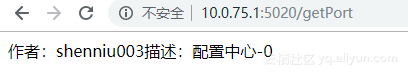 1 @RestController 2 public class ConfigController { 3 4 @Value("${shenniu.author}") 5 private String author; 6 7 @Value("${shenniu.des}") 8 private String des; 9 10 @GetMapping("/getPort")11 public String getPort() {12 return "作者:" + author +13 "描述:" + des;14 }15 }此时运行config-client,通过开放的api接口返回映射的配置信息如下: