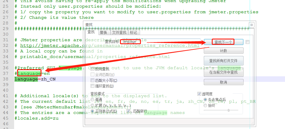 进入jmeter的安装目录,找到配置文件用npp打开,在 # language=en 下面加一行:language=zh_CN,即可实现永久汉化。