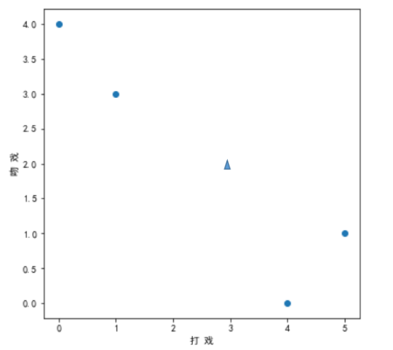 我们把所有数据通过图表显示出来(圆点代表的是自拟的数据,也称训练集;三角形代表的是 X 电影的数据,称为测试数据):