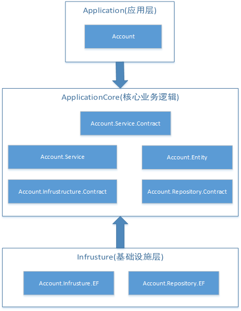 介绍完了六边形架构,接下来回答,为什么有两个接口层。本质上,Account.Repository.Contract和Account.Service.Contract两层契约均归属于核心业务层,Account.Service.Contract用于对应用层承诺,提供什么服务,Account.Repository.Contract和Account.Service.Contract则规定基础设施层必须给自己提供什么操作。如果你愿意,那么这两个接口层完全可以融入Account.Service工程中,这都是没问题的,本来他们就属于业务逻辑的范畴,但我还是把它单独分出来,否则便是应用层、基础设施层直接硬依赖Account.Service,一者太重,二者不符合将面向接口编程。