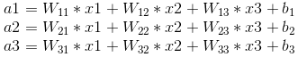 其中,x1、x2、x3为全连接层的输入,a1、a2、a3为输出,根据我前边在笔记1中的推导,有