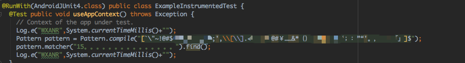 发现一段超级复杂的正则(部分位置打码),所以初步断定为可能是正则时间太长导致。于是写了一个单元测试,来测试该正则是否有问题。