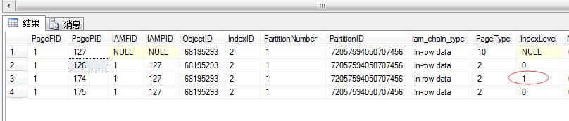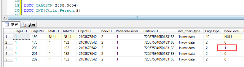从上面的图中大概可以看到,当我插入完毕后,现在有4个索引数据页,其中PID=200的为分支数据页,其他三个为叶子节点数据页,分别