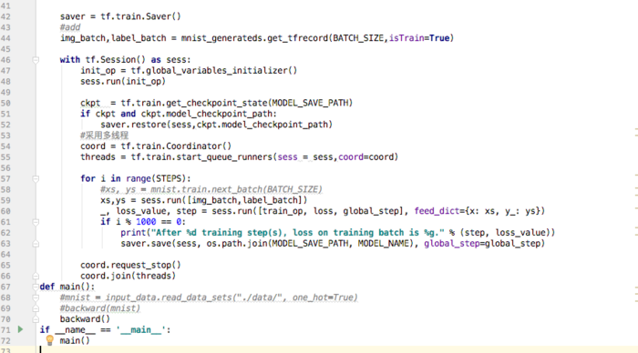 之前我们是使用函数xs,ys=mnist.train.next_batch(BATCH_SIZE),这个函数是mnist已经自己封装好的格式,而现在我们使用xs,ys=sess.run([img_batch,label_batch])来批量获取图片和标签的数据.