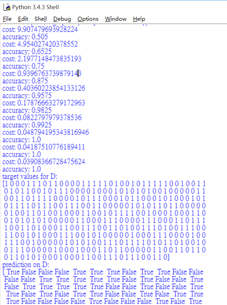 输出结果如下所示,可以看到误差在不断减小,其预测正确率也是不断增加,最后到100%。