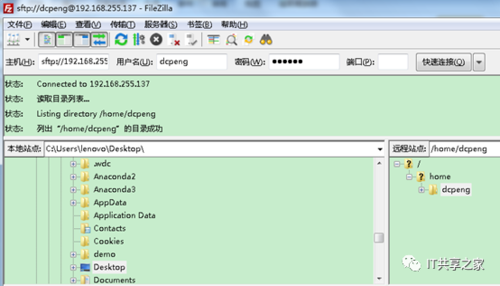 解决方法也很简单,将用户名改为自己设定的用户名即可,本例中是dcpeng,设置好之后,再次尝试连接,便可以顺利的连接上了,如下图所示。