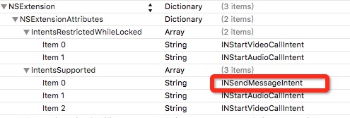首先,我们需要在 Intents Extentsion 的 info.plist 文件中配置须支持的 Siri Intents,在 IntentsSupported 中加入 INSendMessageIntent,如果需要在锁屏时禁用某个功能,则再在 IntentsRestrictedWhileLocked 中加入相应项的 Intent,如图3所示。