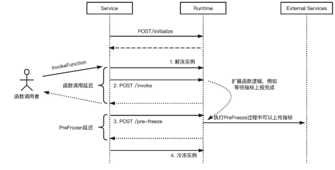根据这些痛点发布了运行时扩展(runtime extensions)功能。该功能在现有的 HTTP 服务编程模型上扩展,在已有的 HTTP 服务器的模型中增加了 PreFreeze 和 PreStop webhooks。扩展开发者实现 HTTP handler,监听函数实例生命周期事件,如下图所示:
