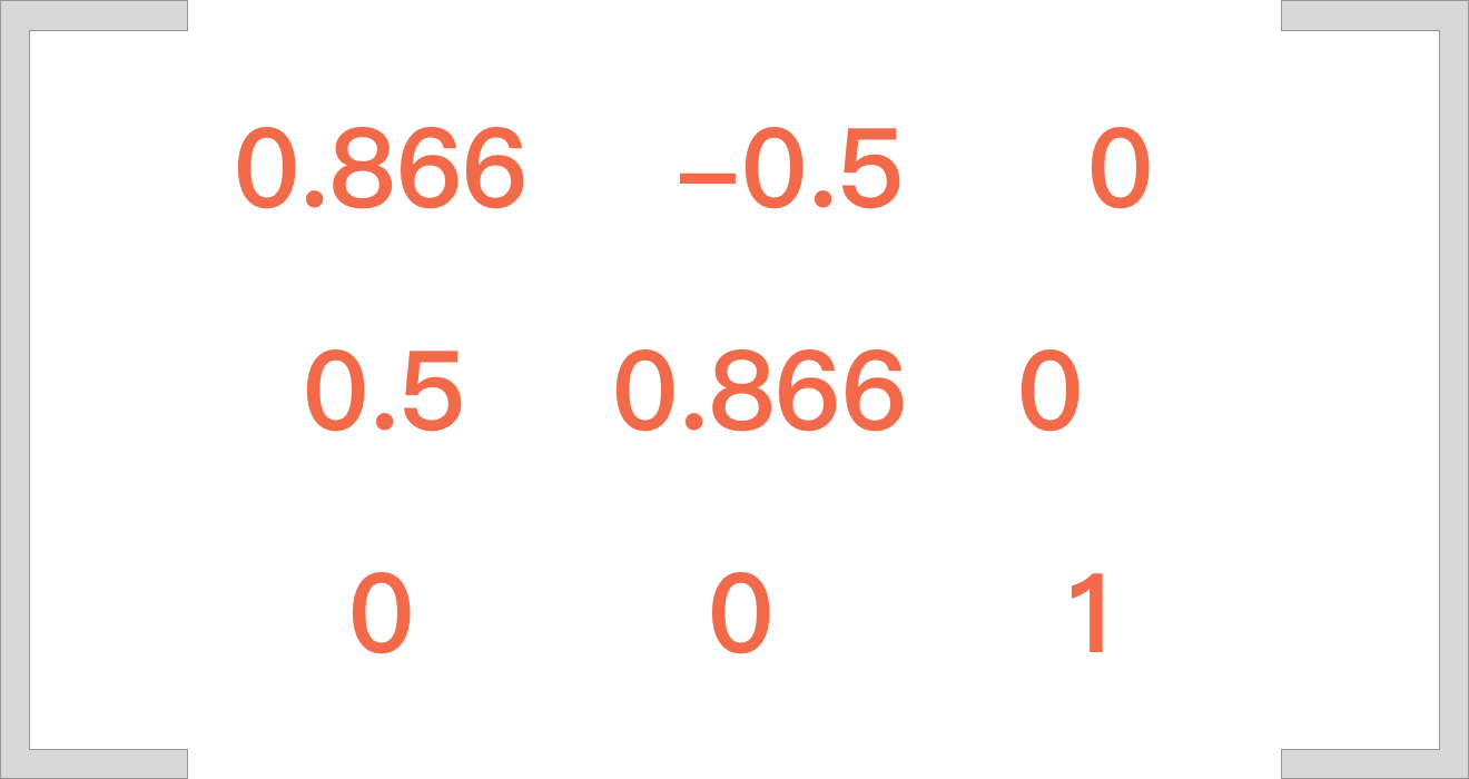 如果我们不考虑缩放和偏移,只旋转30°,矩阵应该表示为