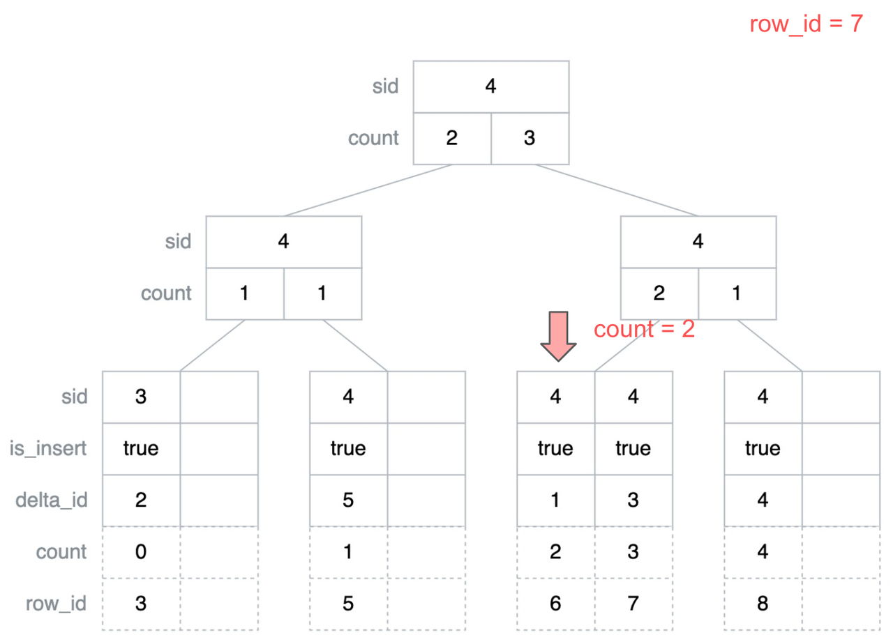 下面以查找 row_id = 7 所在的最右侧叶子节点为例演示一下上面的算法,首先从根节点开始遍历,此时 count 的初始值为 0,根节点的 sid 加上其左子树的 count 值小于要查找的 row_id,即右子树最小的 row_id 小于要查找的 row_id,因此接下来需要继续遍历右子树。