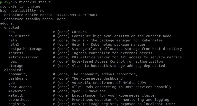 安装完 snap install 后,你可以运行 microk8s status 检查集群是否正常运行。