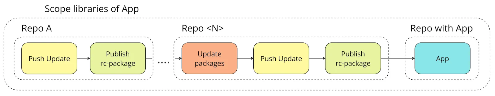 我开发中的示例我曾经遇到过一种情况,人们为每个新库创建一个单独的仓库。任何新功能的创建都需要很长时间,并且发布过程也很漫长。毕竟,除了更新库仓库中的代码之外,还需要为其他库发布该库的预发行版本,并沿着依赖链进行更新。