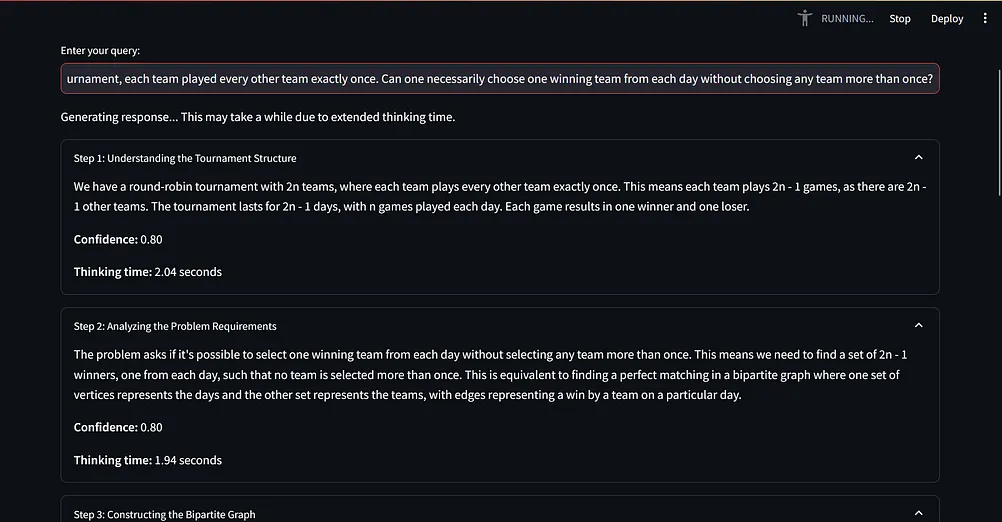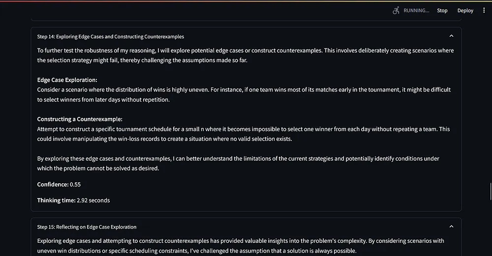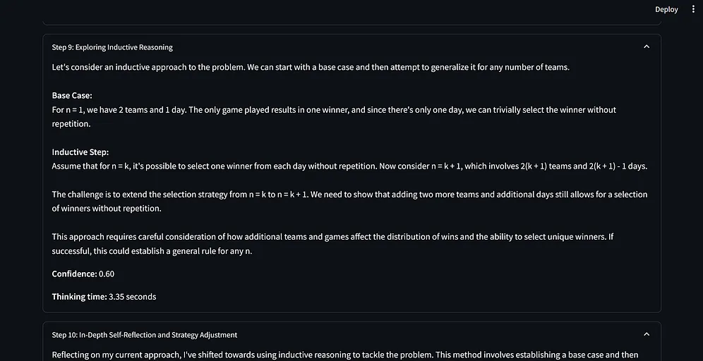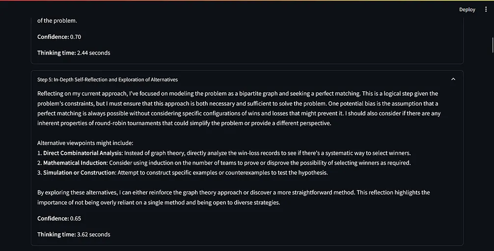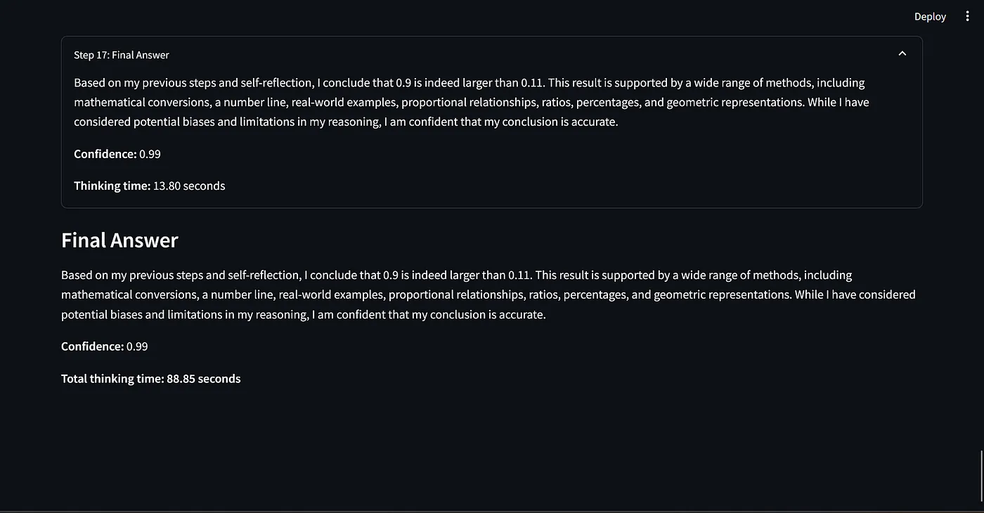 - AI将其推理分解成清晰的步骤,每个步骤都有标题、内容、置信度得分和思考时间。