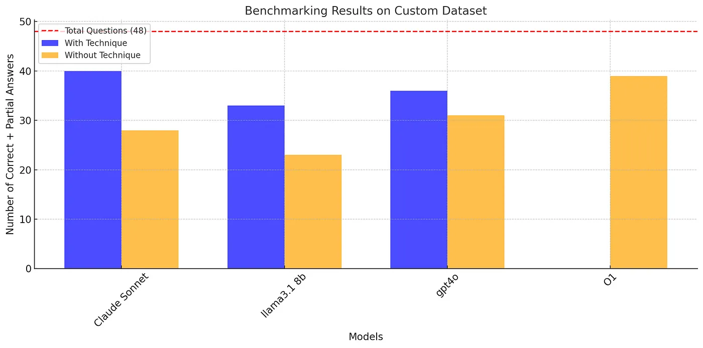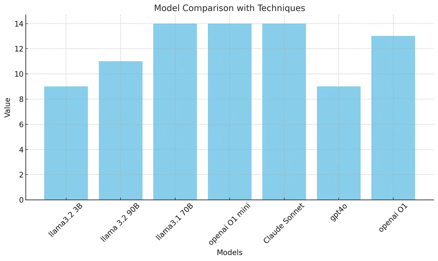从上述基准测试中我们可以看到,使用我们的提示技术,Claude Sonnet 3.5 在需要更好推理能力的问题上优于 O1 和 O1 mini 以及其他小型语言模型。