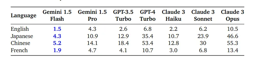 以下表格展示了截至2024年6月的最佳现有模型之间的每输出一个字符的平均耗时的比较:
