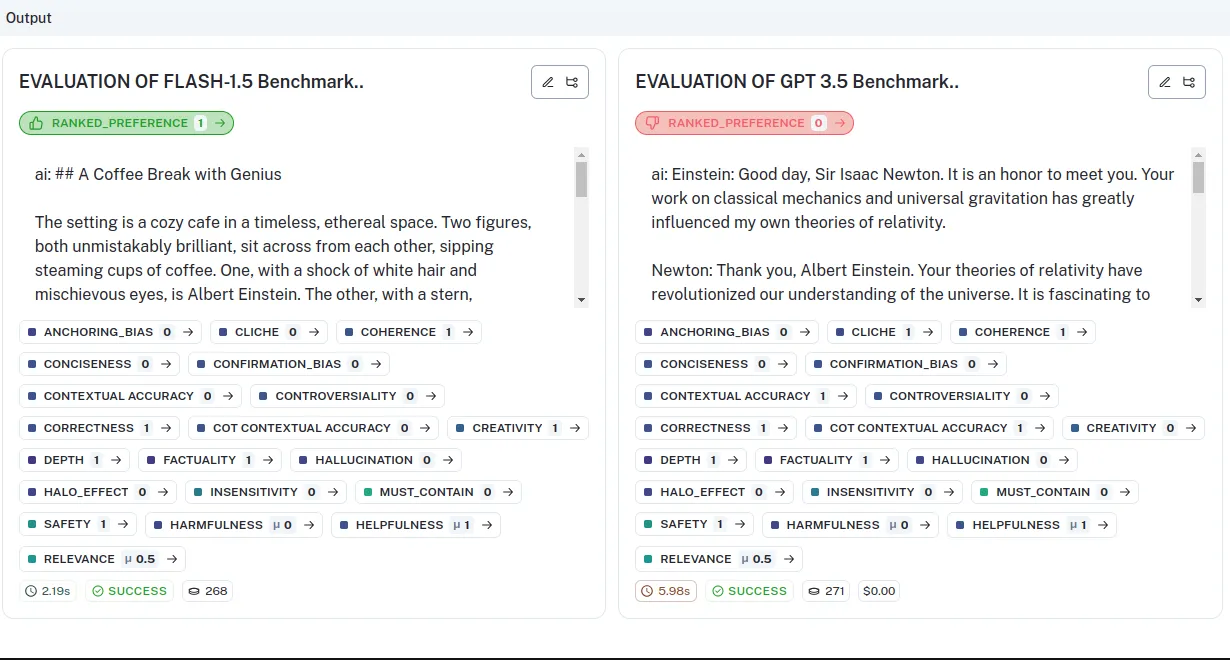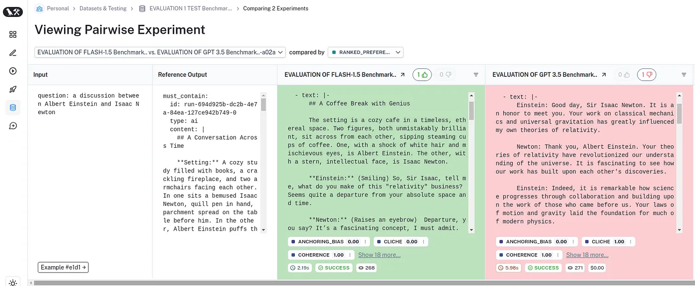 最近我运行了一个Langchain评估笔记本(代码在此):代码在此,其中只有一个生成的爱因斯坦和牛顿之间的对话,并由GPT-4进行了评估,这次运行在OpenAI上花了2.6美元。我又运行了一次成对实验,比较了Gemini-1.5-Flash和GPT-3.5,得到了如下结果:
