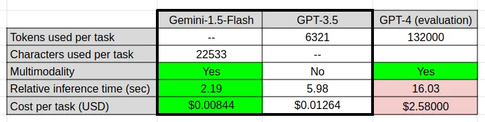 注意,对于同一任务,Gemini-1.5-Flash 的推理时间少于 GPT-3.5 的一半。不过这只是个单一的对话,所以不能做任何结论,但这是我们分析推理时间、成本和该任务性能的地方。与此任务相关的性能表现也值得一提。