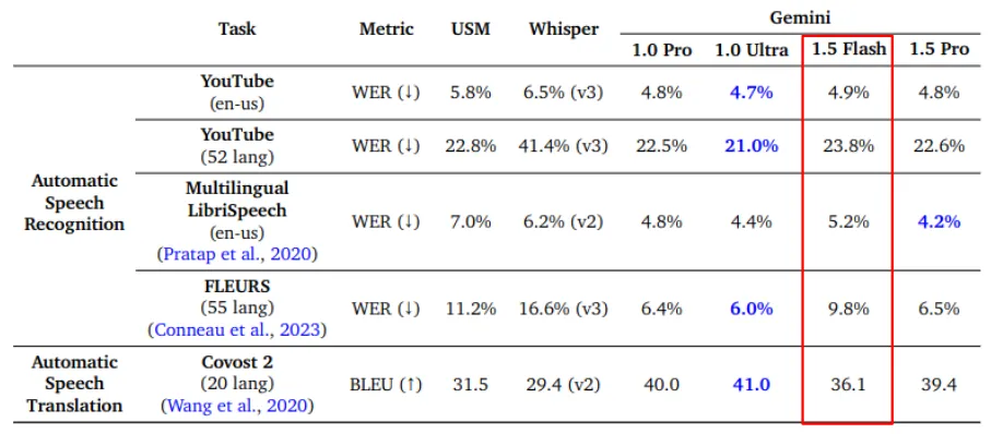 可以看出,Gemini 1.5 Flash 在大多数任务上比 USM 和 Whisper 更好。