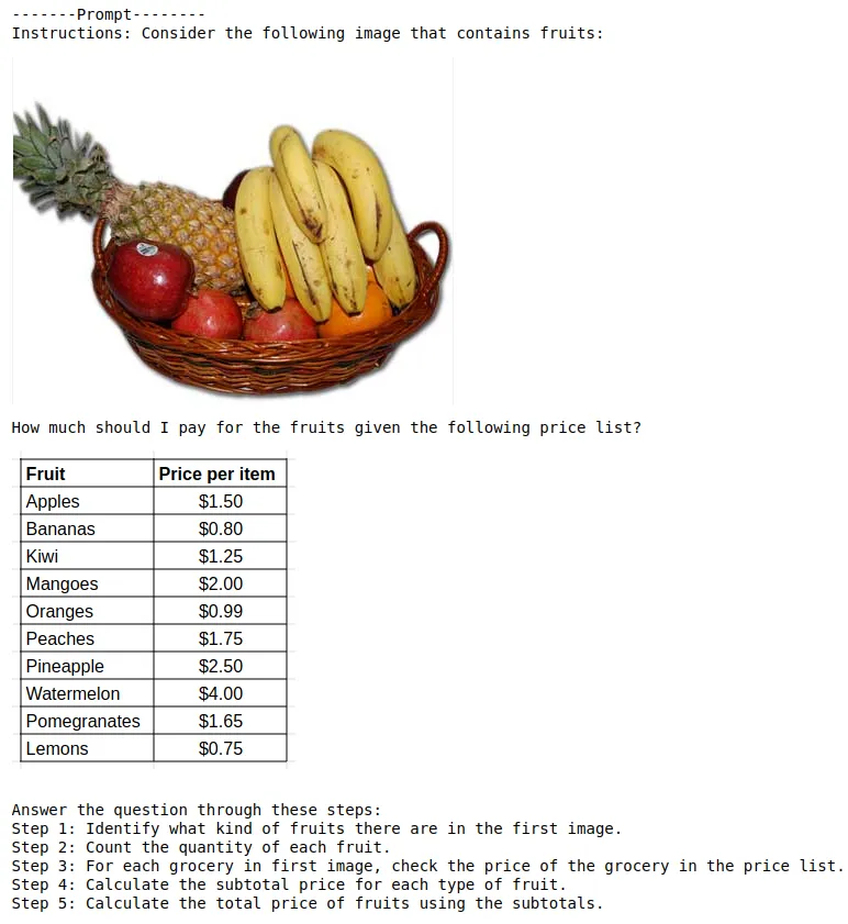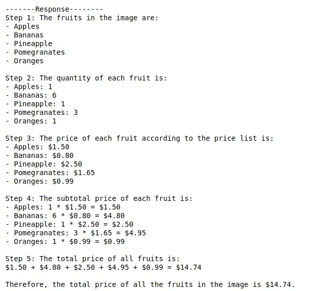 一个第二个例子中,我们将识别水果种类,计数,从图像中的表格里获取它们的价格,进行数学计算并计算总数。这里我采用链式思考,即鼓励模型将复杂任务拆解为一系列步骤