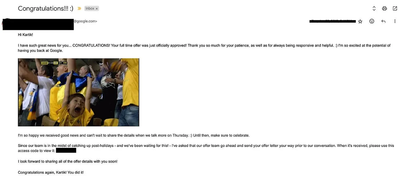 • 两次拒绝了我的梦想公司 Google 的 offer:我收到了 Google 提供的更高薪水的 offer,但我拒绝了,因为这个角色主要是做 Android 开发,没有机器学习的机会。相反,我选择了 Amazon,虽然最初的角色也不涉及机器学习,但可以让我更接近机器学习团队的工作。到目前为止,这是我一生中做出的最好选择!!