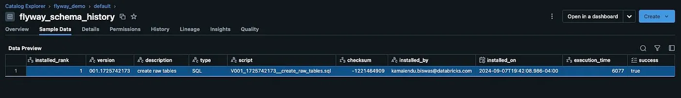 flyway migrate -configFiles="/databricks-flyway-demo/flyway/conf/flyway.toml"` # 这条命令用于迁移数据库配置文件2.a Flyway将在defaultSchema中创建flyway_schema_history表来记录所有更改。