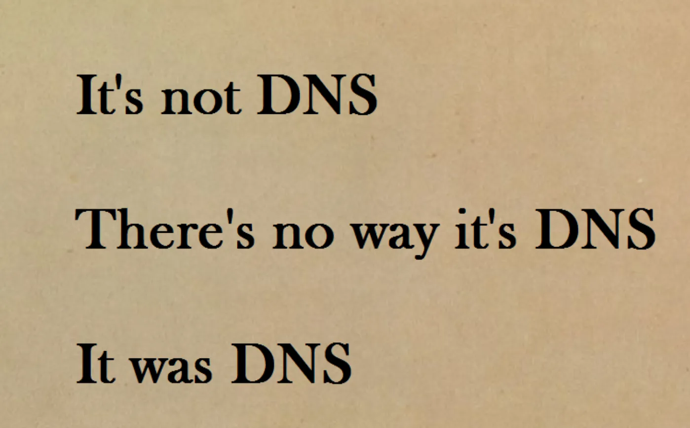 大多数时候,实际上是其他问题,例如,人为错误(第8层问题)。但在这篇文章里,我想告诉你的是,我们花了好几个星期才走出一个不同的“兔子洞”,直到我们发现这次问题果然还是由 DNS 引起的。