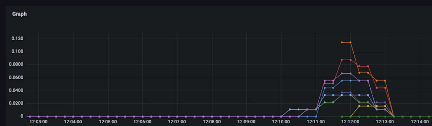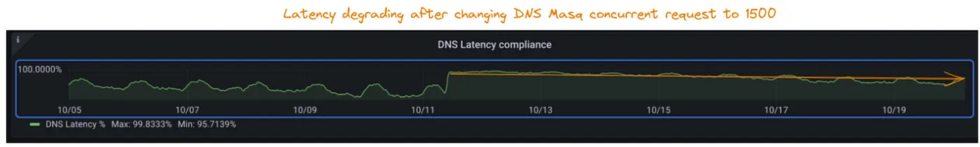 当我们检查受影响集群的DNS延迟SLI时,我们发现它与其他集群相比一直很低。
