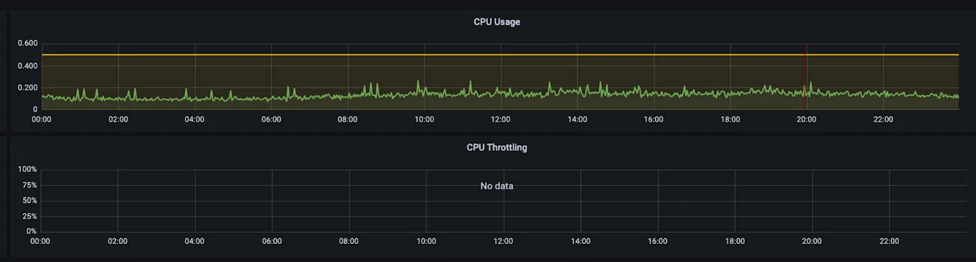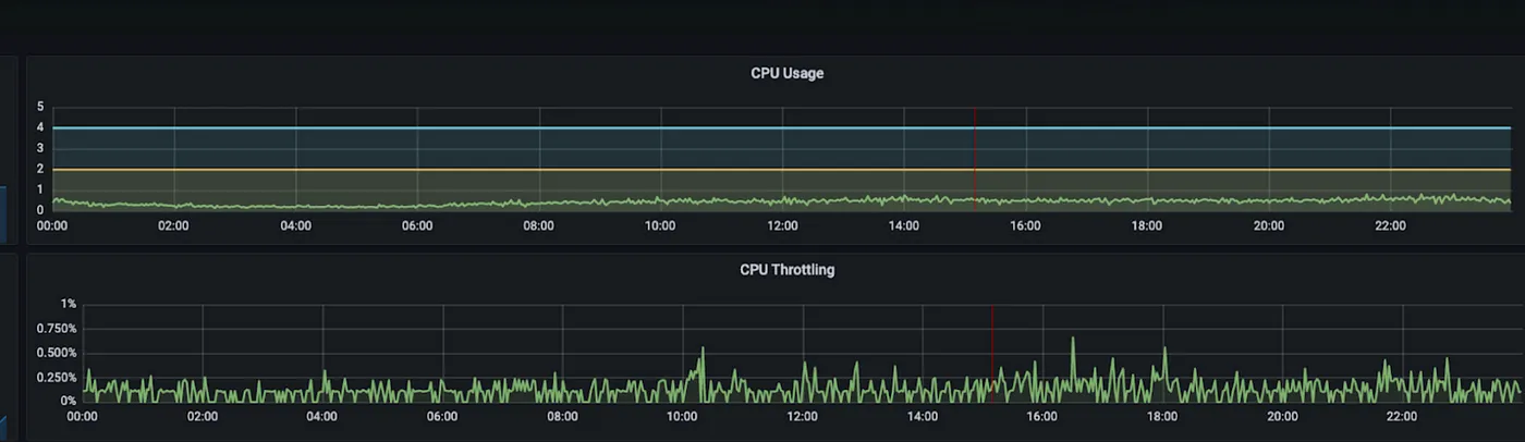 我们也注意到我们的 ingress 控制器中存在少量的 CPU 节流情况。基于这些观察和假设,我们决定将实例的最小数量增加到与峰值相匹配,减少 ingress 被缩减的风险,并给控制器分配更多的 CPU 资源。