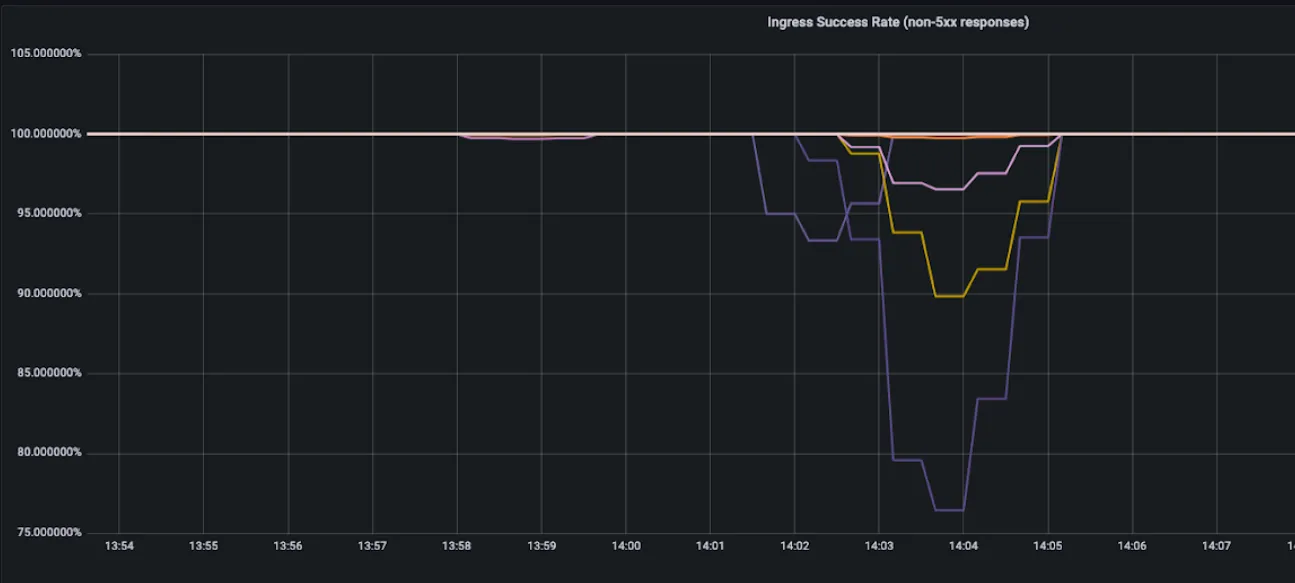 我们确认了 ingress controller 实例的数量不再变化,并且 CPU 指标没有显示节流,所以问题可能在其他地方。