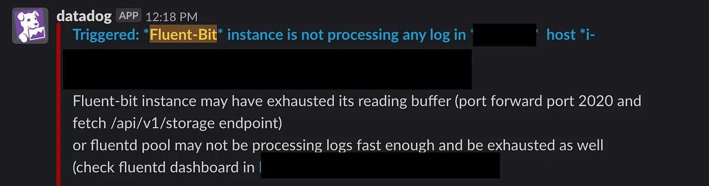 我们为什么会这么认为?这是因为我们可以将一次性能下降与我们内部警报中的一个“A fluent-bit agent stopped processing logs.”关联起来。fluent-bit代理负责监控容器日志并将它们发送到日志转发器。当我们收到该警报时,意味着位于某个节点的fluent-bit代理遇到了网络问题,无法正常转发日志。这导致其缓冲区溢出,阻止代理处理更多日志。