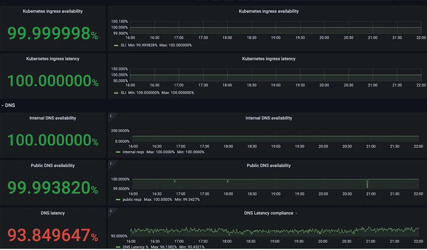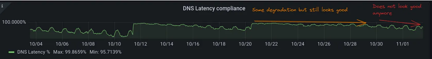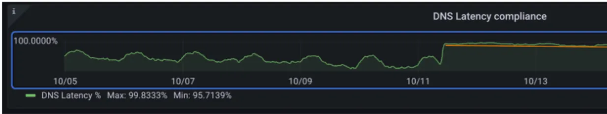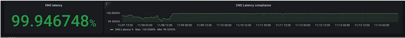 我们的关键绩效指标用于衡量集群中DNS的健康程度是DNS延迟服务等级指标。它通过计算内部请求的在16毫秒内得到解决的百分比和外部请求的在64毫秒内得到解决的百分比来实现。