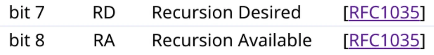 这两个标志,分别是可用递归(RA)标志(由服务器设置的)和所需递归(RD)标志(由客户端设置),在DNS查询及其相应响应中由服务器设置的比特标志。