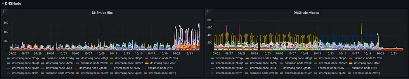 DNS Masq 默认仅允许 每个节点150个并发DNS查询。由于受影响集群中的请求数量较多,我们超过了该限制,因此我们将这个数值从150增加到了1500,如 Google 推荐 的那样。