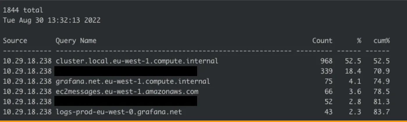 例如,运行DNStop工具给我们提供了非常有价值的信息,这使我们得出了正确的结论,而我们无法在我们的指标系统中获取这些信息。