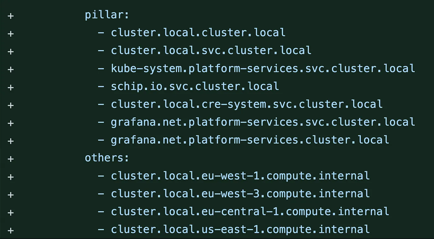 我们引入了一个配置,拦截这些无用域名并返回一个 NXDOMAIN 给客户端。这些请求将不会转发到我们的 CoreDNS 实例,从而防止它们被淹没。