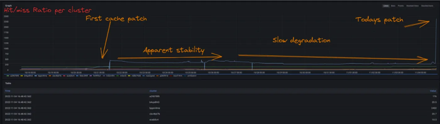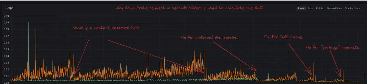 从我们开始修复缓存问题到我们放弃垃圾域名这段时间,性能改进情况如图表所示。你看,我们一实施缓存修复,性能就显著提升了,特别是在图表最右边。在图表最右边可以看到,我们的服务等级指标 (SLI) 有了明显的改进。