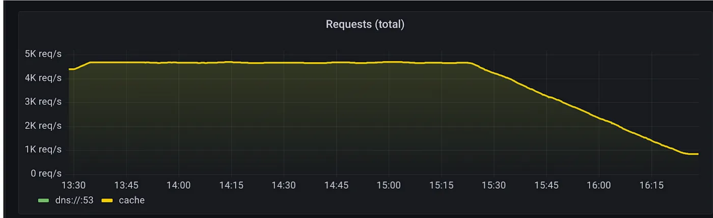 另外,到达集群DNS(CoreDNS)的请求量从每秒超过4000个请求降至每秒不足1000个请求。