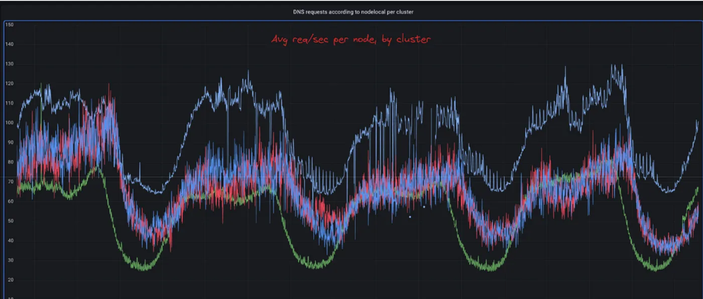 事实上,这个问题确实影响了每一个人。我们发现了2至3个更大的几个集群,其DNS延迟SLI受到影响。然而,这里描述的集群由于其Pod密度(即容器密度)以及运行在上面的应用程序的行为,拥有舰队中最多的DNS查询量。特别是,我们发现有许多CronJobs被安排每X小时运行一次,这些任务安排时会恶化DNS健康状况。因此,问题主要在午夜时被报告。