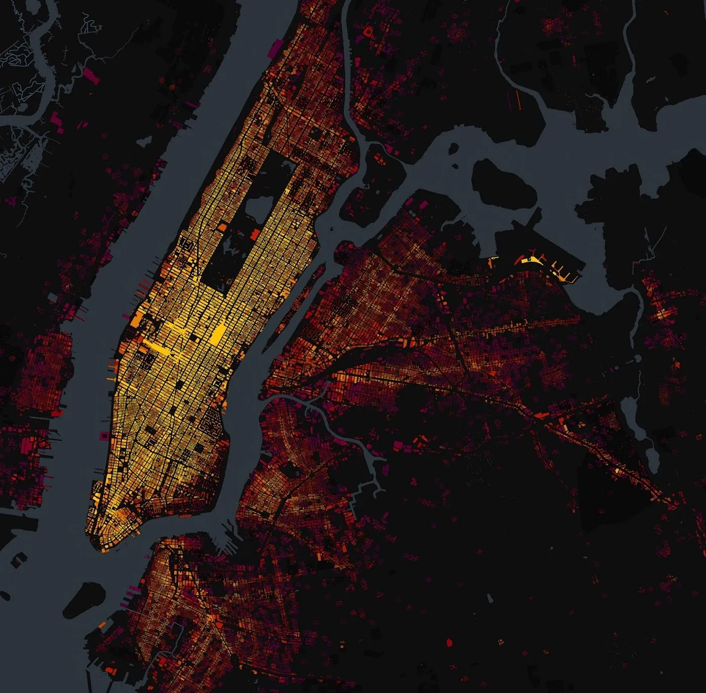H3与GeoJSON的结合有一天我在查看DuckDB_H3_Example时,突然想到,如果我将这些单元格与Overture建筑物连接起来会怎么样呢?通过Fused上的所有示例UDF,我学会了如何使用DuckDB的H3扩展。因此,我在一个Overture的UDF中调用了该UDF,并使用GeoPandas将两者连接起来。结果如下所示的地图。建筑物的颜色表示相应黄色出租车的上车点数量。这个TLC的parquet文件中有数百万个数据点,H3帮助我将这些点聚合到数千个,使空间连接变得更加容易。