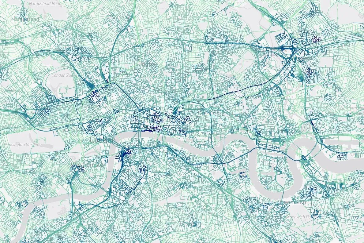 我在继续将H3热力图与Overture类型的数据结合起来。这是显示伦敦交叉点与道路连接情况的热力图。