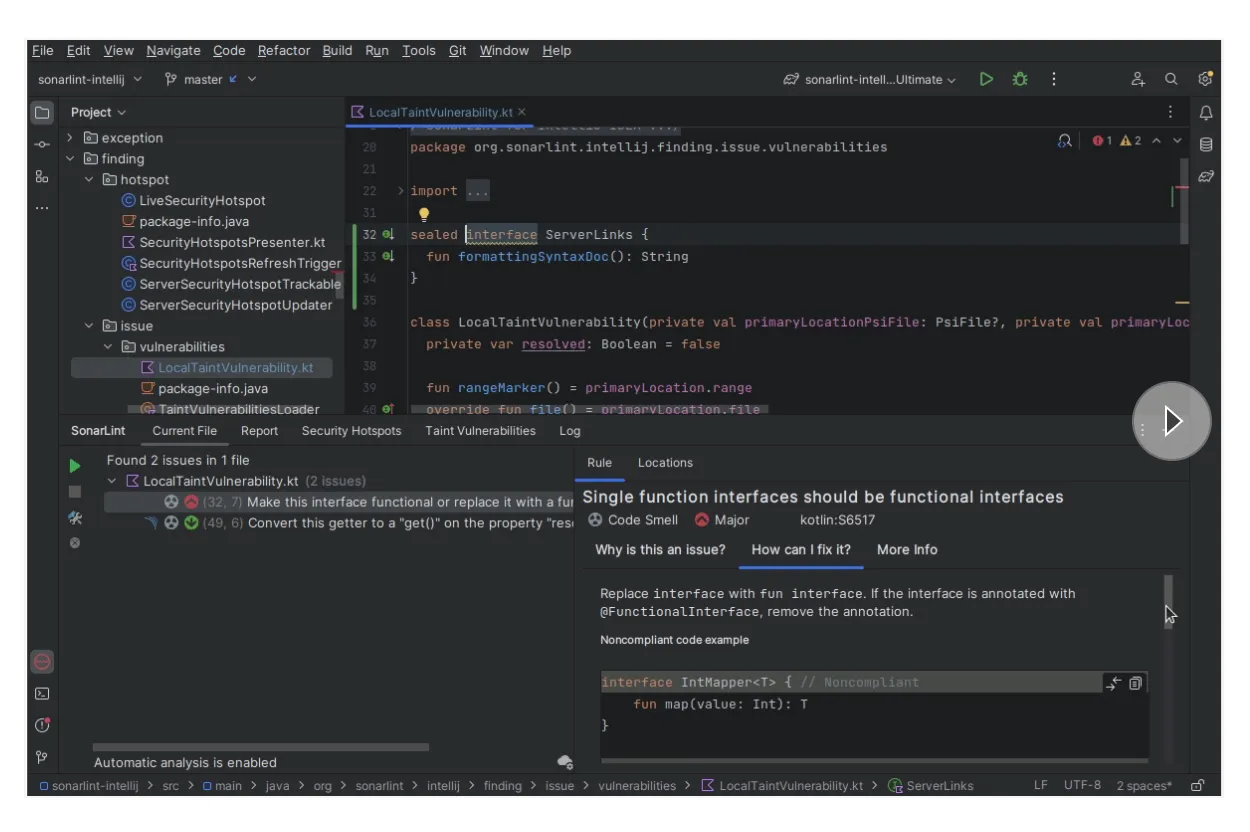SonarLint 是一个静态代码分析工具,可在 IDE 中实时提供关于代码质量的反馈。这确保了代码的质量并遵循最佳实践。
