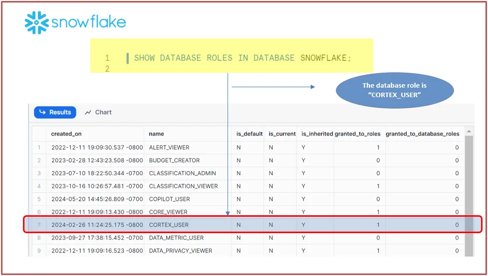 以下是显示数据库角色的详细信息以及用于开始使用Cortex LLM功能的关键命令。该命令指明应使用的角色是哪个。