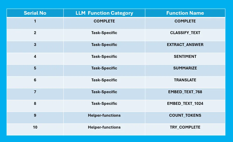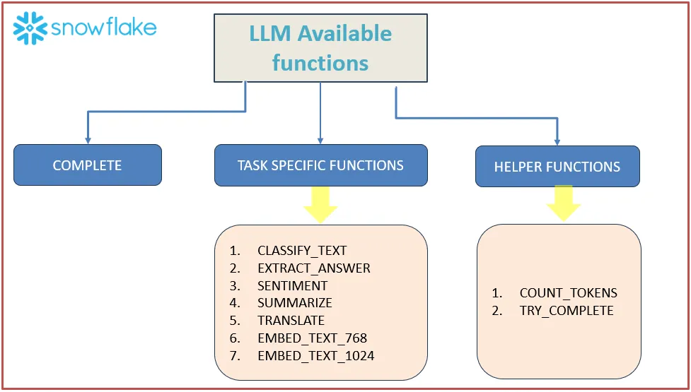 LLM功能包含各种类别,下图展示了Snowflake当前提供的各种类别。